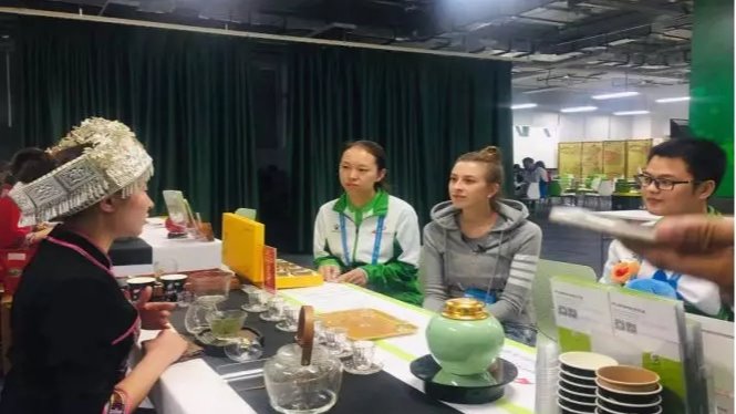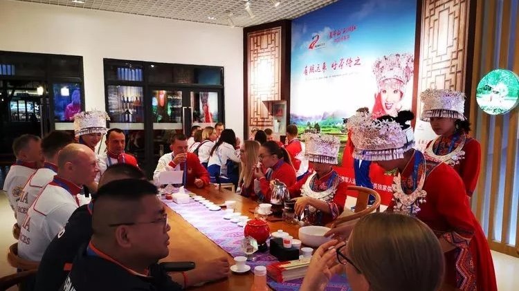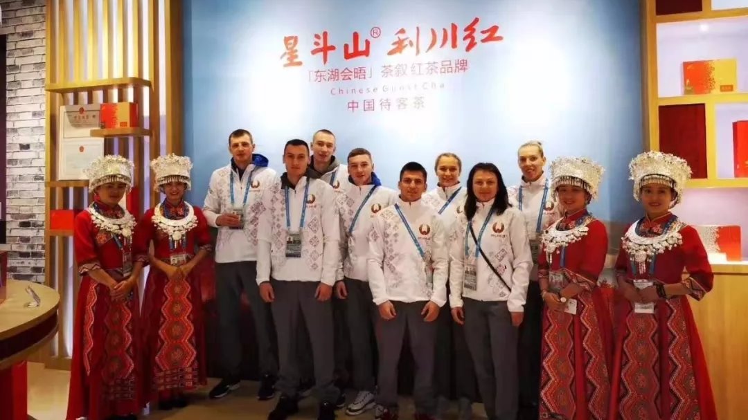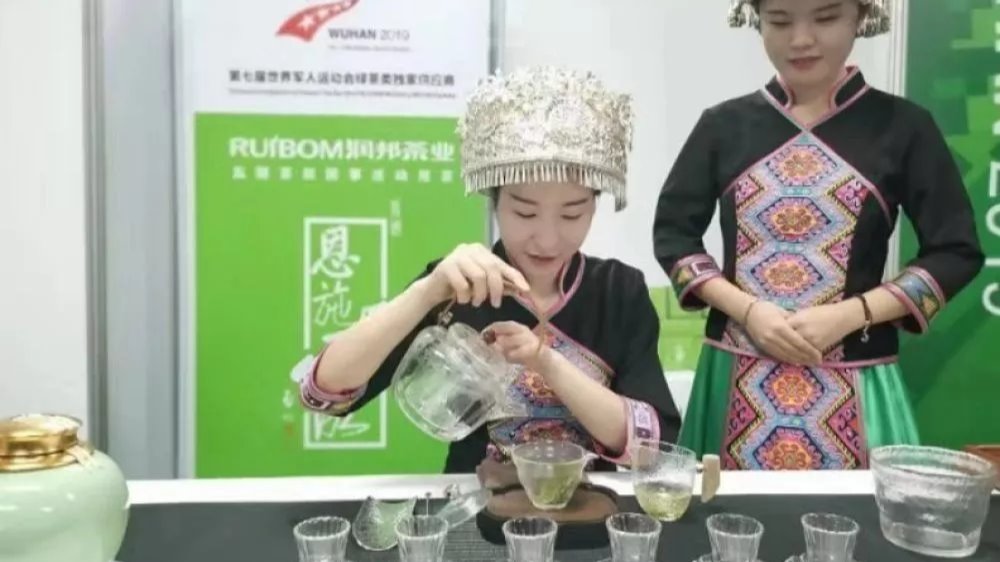 如今,身着亮丽的土苗服饰、热情周到的专业服务,“一红一绿”成为军运村的一道靓丽风景。恩施硒茶在军运村成为各国运动员比赛之余交流沟通,传递友谊的使者!